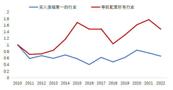 ① 假如2010年以來每年年末買入當年漲幅最好的行業指數,截至2022年11月4日,收益為-35%,不如每年對所有行業等權配置,收益為47%。