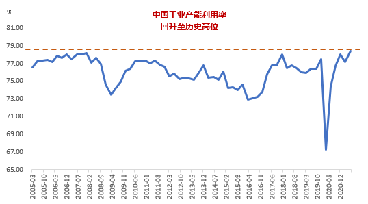 一方面,中國的產能利用率已經提升到歷史同期最高水平,中期內供給能力提升空間十分有限。作為全球制造業產能大國,中國在全球疫情爆發之初通過迅速提高產能利用率,很大程度上填補了其他國家的供給缺口。然而,隨著中國工業產能利用率持續提升,至2021年2季度已經達到78.4%的歷史峰值水平,意味著中期內中國的供給能力進一步提高的空間十分有限。